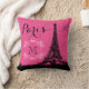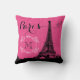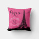 Dit chique felroze kussen is voorzien van een zwarte Eiffeltoren afbeelding met "Paris" in modern script. Een monogram initiaal voor u om te personaliseren wordt omlijst door een witte fancy rol. Achtergrond is een faux burlap textuur in fel roze.