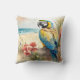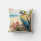 Waterverf kunst van een papegaai, oceaanwater en tropische bloemen.
