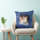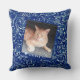 Pas het kattevoer van de lijst op donkerblauwe tex kussen
