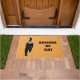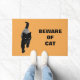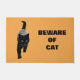 Fotografie van een schattige zwarte kat op een oranje achtergrond met de tekst Pas op voor de kat.