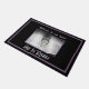 Doormat afgebeeld met een zwarte achtergrond, paarse en goudkleurige randen rond een afbeelding van een heilige bijbel met een afbeelding van een thorny crown, die een hartvorm vormt in de middelste crease van de bijbel die in het midden van de doormat wordt gedrukt. Hij is Risen in grote witte tekst onder het afbeelding. Bovenaan staan de woorden "Welkom bij ons thuis".