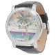 This delightful round wall clock features a charming stained glass style illustration of a single palm tree on a serene beach. Soft pastel hues of pink, peach, blue, and lavender create a calming sky and ocean. The stylized design evokes a gentle, retro-inspired tropical vibe. With clear numerals and black hands, this clock combines artistic appeal with practical timekeeping, perfect for a relaxed setting.