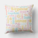 Pastel preppy glimlach gezichten ster aangepaste naam schattige preppy geïnspireerde grafische gepersonaliseerde naam kussen patroon ontwerp. Deze gedempte zachte aqua blue, roze, koraal, gele en schemerige roze tekst typografische deken kan ook worden aangepast met uw eigen korte naam, momenteel leest Sophie. Andere namen en kleuren beschikbaar of neem contact met me op voor naamverzoeken. Deze originele grafische lijnkunst met vrolijke lachende gezichten, vlinders, bloemen, regenboogstrepen en sterren en is ontworpen door Sarah Trett voor exclusief voor www.mylittleeden.com