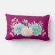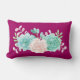 Een lumbale kussen met een magenta achtergrond. Een pastelkleurige waterverf bloem bovenaan. De bloemen, bladeren en sprietjes zijn pastelroze en groen. Creëer met waterverf verf en gedigitaliseerd. Verse en summiere.
