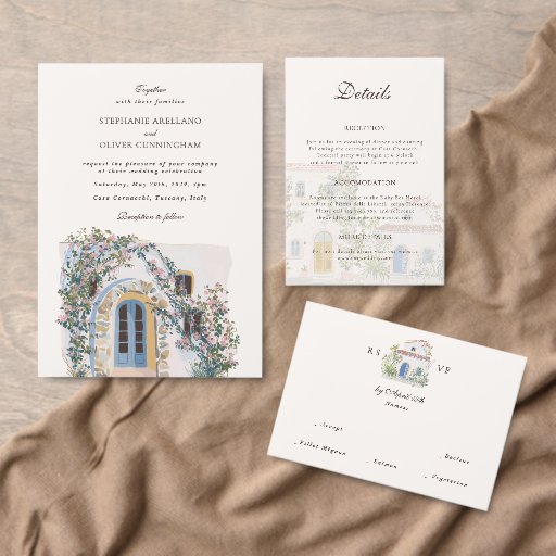 Square wedding save the date featuring beautiful mediterranean inspired watercolor illustrations paired with elegant script and serif fonts in which all your personalized information is written in. You can find more matching products from this stunning wedding collection in our store.