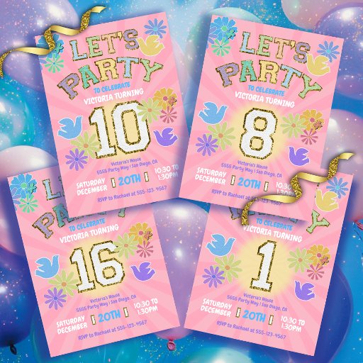 Kleurrijke Patch Letter verjaardagsfeestje uitnodiging, voor een 8-jarige, met een hippie retro vibe. Andere pagina's beschikbaar! Voorzien van pastellettertypen met faux glitter accenten en preppy bloemen en duiven op een sunburst achtergrond de leeftijd van de jarige! Alle bewoordingen kunnen worden gewijzigd, behalve de leeftijd en de woorden "Let's party", maar u kunt ze verwijderen. Ga voor meer wijzigingen naar Deze sjabloon personaliseren. Onderaan zie je "Wil je dit ontwerp nog verder aanpassen? Klik op het gereedschap Bewerken met het gereedschap Ontwerp. Van daaruit kunt u enkele lettertypen en enkele kleuren wijzigen, dingen verplaatsen of verwijderen wat u nodig hebt.