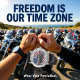 This watch face features a black bagger-style motorcycle, centered against a dynamic American flag backdrop that radiates outwards. A stylized sun is setting on the horizon behind distant mountains. The design combines patriotism with a love for motorcycling, clearly displaying white watch hands and numbers for time-telling.
