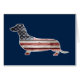 Patriottische kaart bevat een silhouet van een dachshund gevuld met de sterren en strepen van Old Glory met een bijtende houthedragende werking. Dit lege, rode, witte en blauwe wenskaart is perfect voor het hondenliefhebber dat elke Amerikaanse feestdag viert die ons land en ons leger vereert.