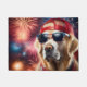 Een Golden Retriever met een Amerikaanse zonnebril en een rood pet poseert met een achtergrond van levendig vuurwerk dat de nachtelijke hemel verlicht