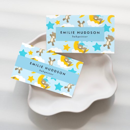 Schattigee, leuke en schattige visitekaartjes met teddyberen, maanwolken en sterretjes. Modern en trendy design, perfect voor kinderopvang, kinderopvang, babysitters, kindermeisjes en oppasbureaus.