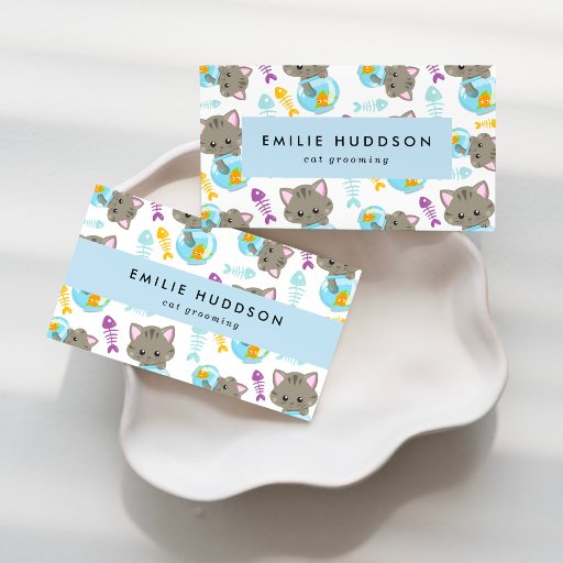 Schattigee, leuke en schattige visitekaartjes met katten, viskommen en vissen. Modern en trendy design, perfect voor dierenwinkels, kattenoppassers, kattenverzorgers en kattenfokkers.