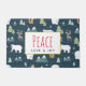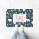 Een deurmat met een grillig feestelijk patroon. Polaire beren, rendieren, bomen, vossen en sneeuwvlokken. Op een donkergroene achtergrond. Een rechthoekig lijst met een faux gouden folie rand met peace love & joy, geschreven binnen.