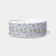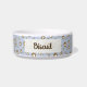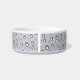 Pet bowl with a personalized dog name monogram in a cute script font paired with a pattern featuring ditsy paw print cookies and sugar dollops as a background. Check out our store for more matching items from this collection.