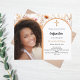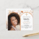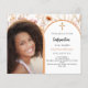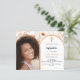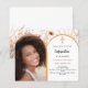 Voeg uw eigen foto met verticale afmetingen toe. Een rozen gouden boogvormige foto lijst. Versierd met roos, perzik, beige wilde bloemen en een gouden kruis. Personaliseer en voeg een naam en details toe. 1 vel = 1 uitnodiging bedrukt rand tot rand.