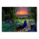 Een levendige pauw wringt door de prachtige tuinen van het Paradijs, en stopt met een lily-pad omgeven meer om door een raam bomen naar een lusteloze oranje, roze en lavendere zonsondergang te kijken.