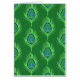 Notitiekaart in een pekelvethertextielafdruk - lichte kalkgroene veren, met een oog in tinten groen, kobalt blauw en aqua, op een diepe groene achtergrond