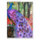 Op zoek naar een exotische pauw? een paarse en saffierse blauwe pauw zit op een houten boomstoom in een prachtige weide vol koraal en roze wilde bloemen . Peacock's veren zijn schaduwen van flox en orchidee met veel browns om de rijke kleuren aan te vullen. Op de achtergrond zijn ook bruine onvruchtbare bomen met luchtige cedargroenen en bamboe-geelloed. Ontworpen door: waterverf kunstenaar Miriam Schulman