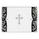 Elegante witte parel kruis en zwarte damast doop en doop dankkaarten. U kunt de tekst die u nodig hebt aan de voor- en binnenkant toevoegen in de gewenste lettertypestijl en -kleur, en u kunt de grootte van het parelkruis verplaatsen en wijzigen.