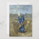 Peasant Woman Binding Sheaves (na Millet) van Vincent Van Gogh, olie op canvas 1889, is een schilderij van een vrouw in een tarweveld dat haikjes oogst en met elkaar verbindt. Van Gogh kopieerde deze samenstelling uit een werk van de Franse Barbizon-schilder Jean-Francois Millet, waarin het klassieke realisme van Millet en het oorrijke palet werden vertaald in het heldere gekleurde palet en de gedurfde tekening van de Post-Impressionistische stijl, met subtiele contrasten van warme geelten en groenen met cool blauw en grijs. Van Gogh schilderde talloze exemplaren na kunstenaars die hij bewonderde in de laatste jaren van zijn leven, en vertaalde de techniek van vorige generaties kunstenaars in de nieuwe, moderne kleurtaal. Vincent Van Gogh (1853 - 1890) was een Nederlandse schilder van de Post-Impressionistische beweging die bekend staat om vette, expressieve tekenvorming, het draaien van borstels en vette, verhoogde kleuren. Van Gogh werkte op jonge leeftijd als kunsthandelaar, leraar en predikant voordat hij de volledige studie van tekenen en schilderen in zijn late twintig jaar opnam. De vroege schilderijen van Van Gogh, beïnvloed door Rembrandt, de 19e-eeuwse Realisten en Barbizon school, toonden studies van arbeiders en boeren in somberaarde tones. Van Gogh kwam in 1886 naar Frankrijk en ontmoette de schrikwekkende innovaties van de impressionistische schilders en begon hun aanpak toe te passen op kleur en materie, die voortgingen in de volwassen stijl waarvoor de kunstenaar het meest bekend staat. Van Gogh produceerde honderden tekeningen en schilderijen, waaronder portretten, landschappen, nog steeds leven- en bloemschilderijen, en talloze zelfportretten die een dominerende invloed werden op de moderne kunst van de 20e eeuw en hem tot een van de populairste kunstenaars van de hele tijd maakten.