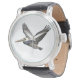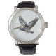 Een pelikaan die op het gezicht van een horloge vliegt.