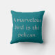 Een prachtige pelikaan grijpt naar de voorkant van deze kussen. Op de achterkant staat: "Een fantastische vogel is de pelikaan."