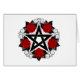 Zwart pentagram met patroon, versierd met bloemen, rode rozen met bladeren op witte achtergrond. Tattoo stijl.