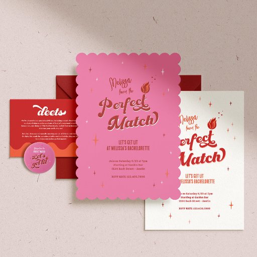 De "Perfect Match" thema vrijgezellenfeest uitnodiging is waar de elektrische energie van de liefde samenkomt met de opwinding van een onvergetelijke nacht. Deze opvallende uitnodiging zet de toon met zijn felroze achtergrond, die de vreugde en warmte van vriendschap en viering symboliseert. De vette rode letters springen eruit met een retro flair, die doet denken aan klassieke romantiek en tijdloze banden, en nodigen gasten uit voor een bijeenkomst vol lachen, liefde en onvergetelijke herinneringen.