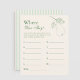 Vermaak gasten met deze Perfect Pear vrijgezellenfeest Where Were They-gamekaart, met handgetekende peren, groene accenten en elegante scripttypografie. Een leuke activiteit die gasten uitdaagt om te raden waar het paar was op verschillende momenten, dit peer thema vrijgezellenfeest spel voegt gelach en interactie aan uw evenement. Perfect voor rustieke douches, boerderijen of op de tuin geïnspireerde douches, deze vrijgezellenfeesten activiteitenkaart combineert prachtig met bijpassende uitnodigingen, borden en peerdecor.
