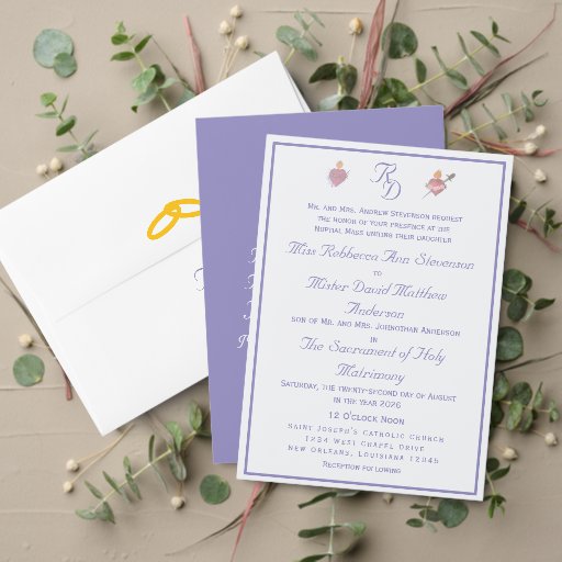 Design front features the initials of bride and groom intertwined and displayed at top. The images of the Sacred and Immaculate Hearts of Jesus and Mary are pictured on either side. Just below, your text is featured in the traditional format for a Catholic wedding invitation and displayed against an off-white background. Entire design is framed with a thin, elegant, periwinkle-purple border.