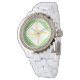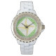 Dit patroon was geïnspireerd op een quiltblokpatroon genaamd "Perpetual Motion". Een 4-punts pinwheel markeert de 3, 6, 9 en 12 uur en is omgeven door groene en witte stippen.