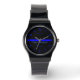 Een gepersonaliseerd monogram Thin Blue Line symbolisch ontwerp op een zwart horloge. Een geweldig cadeau-idee voor bijeenkomsten, herdenkingsfeesten en herdenkingsgelegenheden. Drie regels tekst om dit horloge net zo uniek te maken als jij.