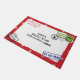 Deze Personalize Christmas deurmat is een kerstbrief die u kunt personaliseren met uw familienaam in het retouradresgebied en u kunt uw eigen kerstadres of Merry Christmas-bericht maken in het verzendadresgebied. Dit ontwerp is een rode envelop met sneeuwvlokken, twee kerstpostzegels en drie postzegels. Een super schattige kerstdeurmat om het kerstseizoen te vieren met feestelijke feestvreugde.