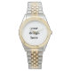 Stijl: Unisex Two-Tone Bracelet Watch Perfect voor elke dag draag, kan dit zilveren en gouden tweetalige horloge worden aangepast aan uw stijl. Voeg uw favoriete design en tekst toe om deze aan te passen voor een verbluffende stijlvermelding! Materiaal: riem: leglair Hoesje: afmetingen van de legering: zijde: 1,16 inch diameterriem: 7,99 x 0,31 inch Hoesje: 1,37 inch diametergewicht: 0,148 lb 3-handanalogon Japan Quartz®; aangepaste afdrukken in kleur op voorkant Veilig over sluiting waterweerstand tegen klemmen: tot 3 ATM (98) 1 jaar meegeleverde batterij met beperkte garantie Dit product wordt aanbevolen voor de leeftijden van 13 jaar