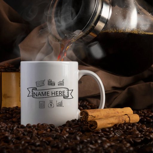 Minimalist finance icon mug with clean black-and-white line art and a hand-drawn name banner. A sleek desk accessory and personalized gift for CPAs tax professionals, and finance students who love a modern, organized look