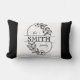 Elevate your home decor with this elegant and timeless personalized family name throw pillow. Featuring a chic black and white color palette, this design showcases a delicate botanical wreath surrounding your custom surname in a sophisticated serif font.