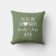 New home typography text housewarming gift for couples. Personalized with the couple's name, the address and the date they established their home. Trendy sage green throw pillow in a modern farmhouse style which emphasizes warmth and a cozy, inviting feel. The design features a white heart, a combination of simple fonts and elegant cursive script.