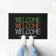 Eenvoudige, gepersonaliseerde Halloween WELCOME mat met naam. Het woord WELCOME wordt herhaald in witte, oranje en groene skeletbottypografie, met een rijke zwarte achtergrond.