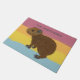 Deze persoonlijke welkomstmat is perfect voor fans van capybaras. Het is klaar om gepersonaliseerd te worden met jouw naam en bevat een afbeelding van een baby capybara of capybara pup in bruin tegen een kleurrijke geverfde gestreepte achtergrond in roze, oranje, geel en lichtblauw.