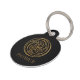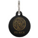 Dramatische zwarte en goudingewikkelde drievoudige Keltische knot zwirl mandala. Eeuwige spiraaltjes en knoppen in goud op een zwarte achtergrond. Gepersonaliseerd met de naam van uw huisdier en uw telefoonnummer, of geef als geschenk.