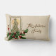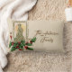 Mooie oude foto van de Heilige Familie bij de Nativiteit met heilige en bessen. De achterkant is een patroon van heilige bessen en bladeren.