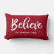 Geloof handschrift | Vakantiegeld Sierkussen in rood. Moderne boerentypografische vormgeving door Blackberry Boulevard "Believe" geschreven in een whitescript lettertype op een solide rode kleur achtergrond. Pas het aan met je familienaam. Andere kleuren zijn in voorraad. Perfecte accentuleuze kussen voor uw vakantiehuisdecor.