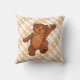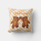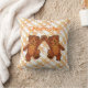Twee bruine teddyberen dragen oranje bogen met een gepersonaliseerde naam met een achtergrond van oranje draden. De achterkant van de kussen sterren die een grote teddystijging vormen een poot om te zeggen hallo. Dit kleurrijke oranje en bruine ontwerp zal een speciale aanraking toevoegen aan de kamer van een kleine jongen. Voeg douanenaam toe gebruikend de verstrekte sjabloon. Origineel ontwerp van Anura Design Studio.