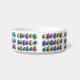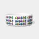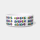 Rijen van driedimensionale ronde en rechthoekige vormen, in groepen van 3x6, bellen de kom. Elke vorm toont een schaduw. De kleuren zijn roze, paars, groen, geel, blauw, en oranje.