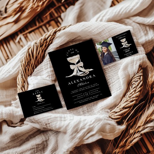 Celebrate her milestone in true coquette style with this elegant pearl-and-champagne graduation design. A soft blush backdrop, delicate bow details, and a shimmering coupe glass create a refined, feminine look that feels both celebratory and timeless. Personalize the text to feature your graduate’s name, event details, and reception information. A perfect choice for a sophisticated graduation gathering with a touch of vintage charm.