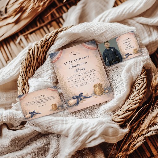 Celebrate a proud milestone with this elegant police academy graduation design, featuring a refined neutral palette, classic law enforcement details, and a formal ceremonial layout. Inspired by traditional graduation announcements, this design highlights service, achievement, and dedication with timeless style. Perfect for honoring a new police officer and sharing this meaningful accomplishment with family and friends.