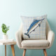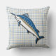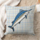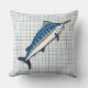 Niet veel vissen zijn ongelooflijk mooi dan de blauwe marlijn — en niet veel vissen zijn groter. De blauwe marlijn is de grootste van de Atlantische marlijn en, serieus, een van de grootste vissen ter wereld. Net als bij sommige soorten is het vrouw vaak een beetje groter dan het mannelijke. Vrouwen kunnen opgroeien tot 14 voet lang en kunnen meer dan 1.900 pond wegen, hoewel het gemiddelde meer dan 11 voet lang en 300 pond oud is. Blauwe mariniers zijn diep blauw op de bovenkant en zilverwit onder, met een uitgesproken rugvin en een lange, dodelijke, speervormige bovenkaak (die sommigen een rekening noemen), een van de gemakkelijkste identificeerbare en herkenbare vissen ter wereld. Mariniers zijn bekend om hun ongelooflijke uitholling in een gevecht als ze verslaafd zijn, wat hen een troebele favoriet maakt van grote spelvissers. Hoewel het ook kan worden gezegd van vrijwel elke supergrote vis, kan ik me niet voorstellen dat er veel meer opwinding is over de vurige angler dan een van deze reuzen te hakken en het water in de strijd te zien breken. Dit ontwerp geeft meer eer aan deze majestueuze vis dan aan de vissers die hem zoeken. Voor deze prachtige kussen leept een enkele blauwe marlijn uit een zee van in kleur gecoördineerd gipsplaat aan beide zijden, waardoor het de perfecte keuze is voor je viskast, strandhuis of 'man grot'.