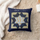 A section of a single quilt block. Text "Quilt Lover" in white script. Block: Quilted yellow, white and dark blue "Star flower" pattern. The central "star" is a white with dark yellow ducks. This is surrounded by "petals" of dark blue with red, blue and yellow flowers. Surrounding that is yellow and white gingham check. Background/back of pillow is dark blue.