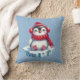Een schattige waterverf pinguïn zittend op een ijsberg met een rode sjaal, pet en oorkappen met sneeuwvlokken.