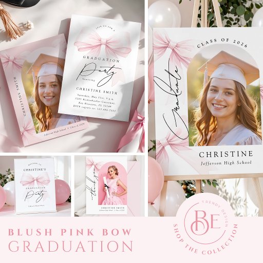 An elegant graduation welcome sign featuring a soft pink bow and refined typography, designed to greet guests with a chic and feminine touch. Perfect for graduation parties, this sign adds a timeless coquette aesthetic to the celebration, blending classic elegance with modern style. Ideal for displaying at the entrance of high school or college graduation events.