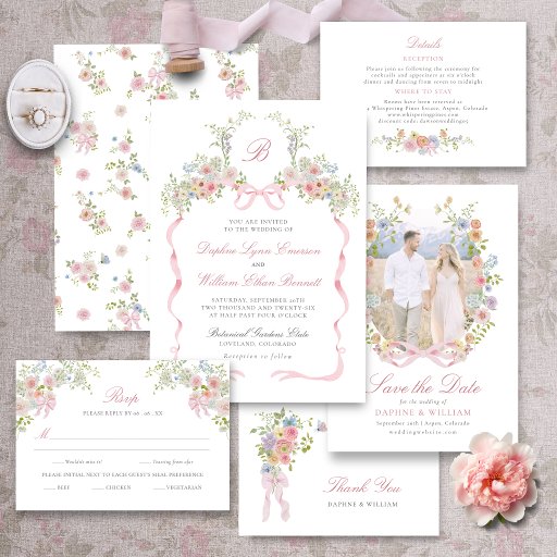 Pink Bows and Wildflowers Details Enclosure Card. This horizontal details card features a romantic watercolor floral arrangement with delicate greenery and soft pink bows. Inspired by a Victorian English garden, the design offers an elegant and airy way to share wedding information. The timeless floral style blends seamlessly with the rest of the collection.